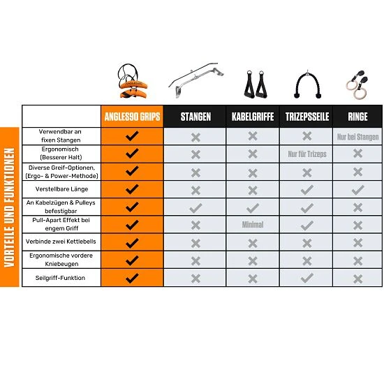 Die Angles90 Handgriffe „Grips“ sind frei bewegliche Griffe, welche mit einer Schlaufe versehen sind. Sie sind schnell an der Langhantel, Klimmzugstange oder Rudermaschine angebracht und eignen sich für jegliche Zugübungen an Trainingsgeräten, bei der man im Ober-, Unter- oder Neutralgriff nicht entfliehen kann. Ob Rudern, Klimmzüge oder Kreuzheben an Geräten – Vorteil der Angles90 ist, dass die Handgelenke durch die Handgriffe frei beweglich sind und somit auch in den Armen und Schultern. Besonders praktisch: Durch seine Ergonomie ermöglicht der Handgriff eine größere Zugkraft. Je nach Schwere des Workouts ist ein Wechsel zwischen dem Ergo- und dem Power-Griff, bei dem das Ende nach oben schaut, möglich. Aber auch Drück-Übungen am Kabelzug oder Schlingentrainer sind hervorragend möglich.