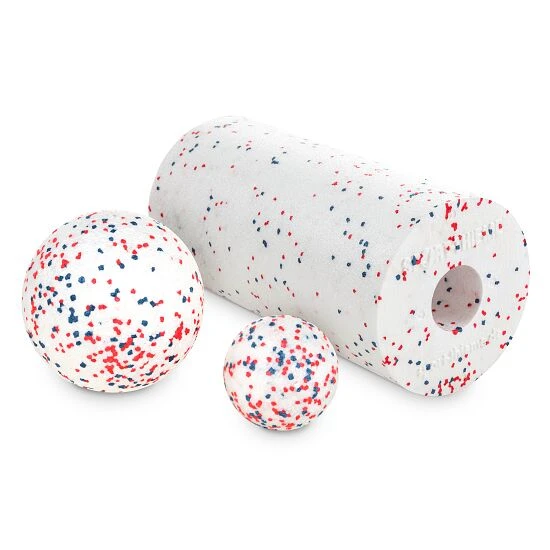 Das Sport-Thieme Faszienset besteht aus einer 30 cm langen Faszienrolle. Dieser Faszientrainer eignet sich ideal zur großflächigen Behandlung wie z. B. dem Rücken oder der Beine. Mit dem Faszienball hingegen ist das Training für besonders schwer erreichbare Körperregionen zur punktuellen Behandlung möglich. Der Ball besitzt zudem kleine Aussparungen, die dafür sorgen, dass der Faszientrainer nicht wegrollt. Sowohl der Ball, als auch die Rolle sind aus EPP