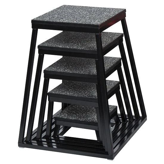 Das Sport-Thieme Plyoboxen Set überzeugt durch die besonders hohe Standsicherheit der einzelnen Boxen. Die vollverschweißte Konstruktion macht dieses Trainingsgerät sehr stabil und sorgt durch eine gummierte Oberfläche für noch mehr Sicherheit bei Ihrer Trainingseinheit. 5 verschiedene Höhen machen Ihr Training vielfältig und variantenreich. Nach dem Workout können Sie die trapezförmigen Boxen platzsparend verstauen.