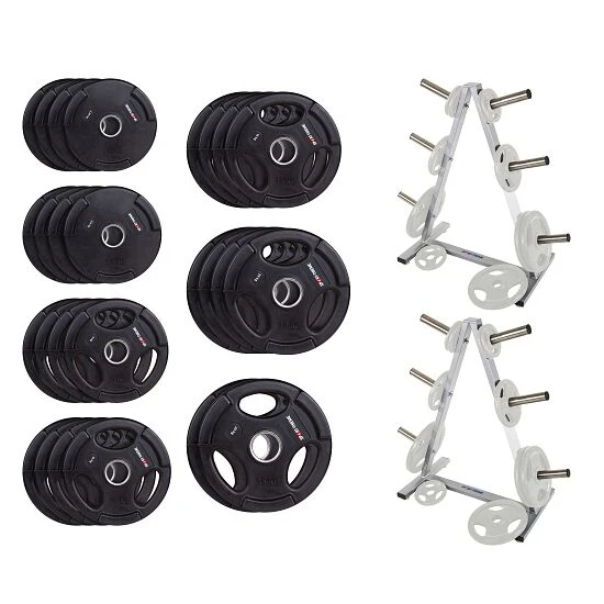 Das Sport-Thieme PU Wettkampf-Hantelscheiben-Set mit Ständer ist dank seiner PU-Beschichtung besonders widerstandsfähig und unempfindlich gegen Schläge, Abrieb und Kratzer. Auch sind sie geräuschdämpfend und durch die hochwertige PU-Ummantelung unanfällig gegen Rost. In der Bohrung befindet sich ein korrosionsbeständiger Stahlring. Die Scheibenaufnahme auf Hantelstangen wird dadurch vereinfacht. Ein echter Pluspunkt sind auch die beiden im Set enthaltenen Sport-Thieme Scheiben-Ablageständer. Sie sorgen für eine platzsparende und übersichtliche Lagerung der Hantelscheiben – ein Rundum-sorglos-Paket für Studios, Vereine und Behörden.