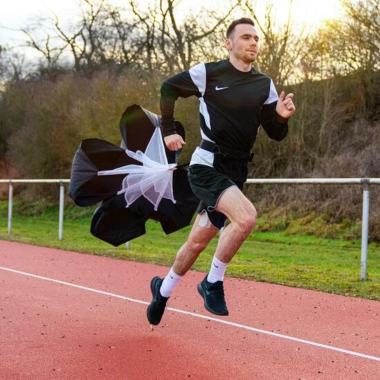 Der Sport-Thieme Sprintfallschirm „Premium“ besteht aus Polyestergewebe und ist daher besonders leicht. Mit dem Sprintfallschirm können Sie die Beinmuskulatur stärken und so Antritt, Explosivität und Schnellkraft steigern. Ein Partner ist für das Training mit dem Schirm nicht notwendig. Der gepolsterte, größenverstellbare Hüftgurt verbindet den Läufer dabei mit dem Schirm. Dieser wiederum erhöht den Luftwiderstand um ca. 10–15 kg, je nach Laufgeschwindigkeit.