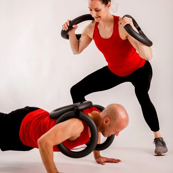 Die Togu Gewichtsringe „TrainChain“ sind für alle Arten von Krafttraining geeignet. Sie ermöglichen Ihnen eine große Zahl an bekannten Übungen mit Zusatzgewichten wie Langhantel, Kurzhantel, Gewichtsscheibe, Kettlebell und Medizinball. Dabei steht das Trainieren mit dem eigenen Körpergewicht im Vordergrund und wird noch effektiver. Besonders hervorzuheben ist, dass sich die Ringe perfekt über die Schulter legen lassen – so haben Sie die Hände beim Workout frei.